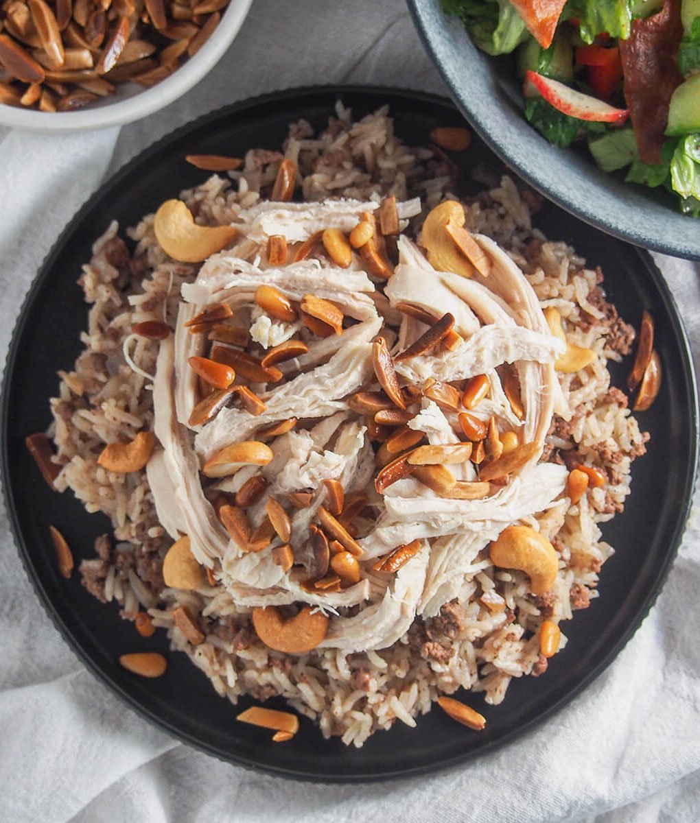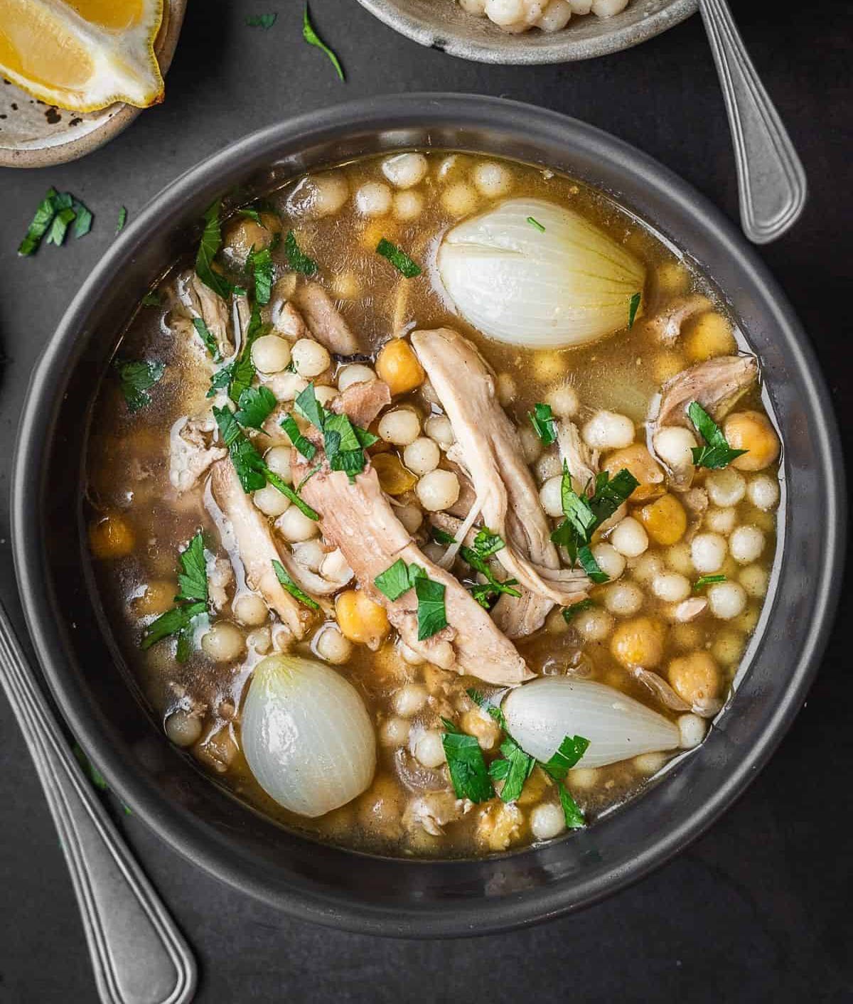 Pearl couscous with chicken lamb, chickpeas & caramelized onions